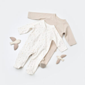 Set 2 salopetele cu maneca lunga si pantaloni lungi cu botosei – 100%bumbac organic – Crem cu buline, BabyCosy (Marime: 0-3 Luni)