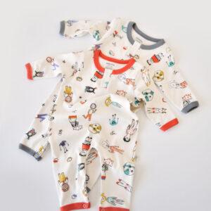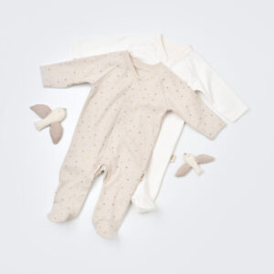 Set 2 salopetele cu maneca lunga si pantaloni lungi cu botosei – 100%bumbac organic – Ecru cu buline, BabyCosy (Marime: 6-9 luni)
