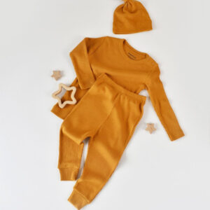 Set 3 piese: bluzita cu maneca lunga, pantaloni lungi si caciulita din bumbac organic si modal – Mustar BabyCosy (Marime: 6-9 luni)