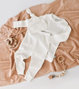Set 3 piese: bluzita cu maneca lunga, pantaloni lungi si caciulita din bumbac organic si modal – Ecru, BabyCosy (Marime: 12-18 Luni)