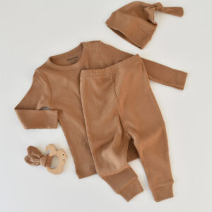 Set 3 piese: bluzita cu maneca lunga, pantaloni lungi si caciulita din bumbac organic si modal – Maro, BabyCosy (Marime: 18-24 Luni)