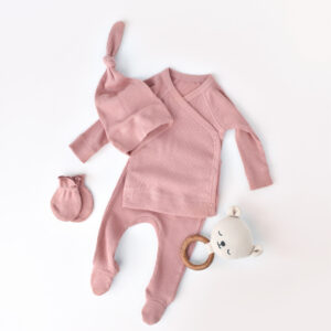 Set 4 piese: bluza, pantaloni, caciulita si manusi din bumbac organic si modal – Rose, BabyCosy (Marime: 0-3 Luni)