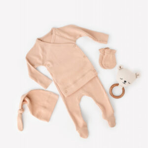 Set 4 piese: bluza, pantaloni, caciulita si manusi din bumbac organic si modal – Somon, BabyCosy (Marime: 0-3 Luni)