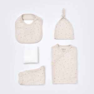 Set 5 piese pentru nou nascut – 100% bumbac organic – Crem cu buline, BabyCosy