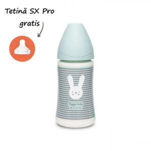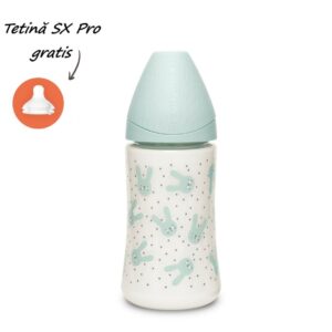 Biberon 270 ml cu tetină rotundă din silicon, 3 fluxuri, iepuraș cu linii verzi, Hygge Suavinex