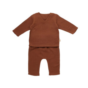 Set bluzita petrecuta si pantaloni lungi din muselina, BabyCosy, 100% bumbac organic, Caramiziu (Marime: 3-6 Luni)
