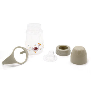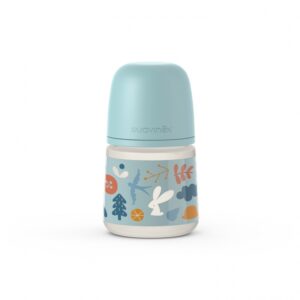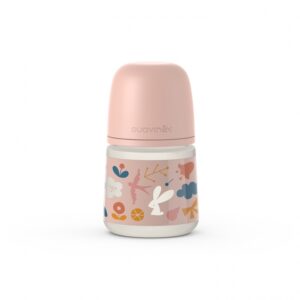 Biberon din sticlă 120 ml cu tetină rotundă din silicon, debit lent, iepuraș gri Hygge Suavinex