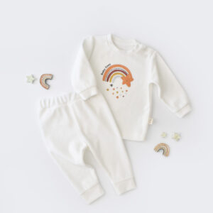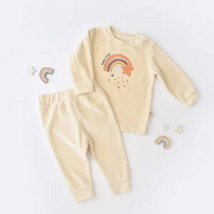 Set Curcubeu cu bluzita cu maneca lunga si pantaloni lungi din 80%bumbac organic si 20% poliester – Crem, BabyCosy (Marime: 18-24 Luni)