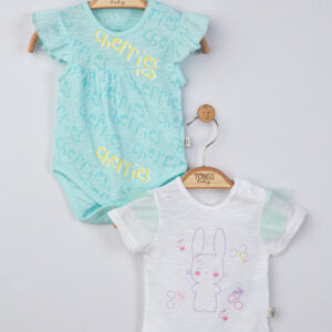 Set de 2 body-uri cu volanase turcoaz pentru nou nascuti, Tongs baby (Marime: 6-9 luni)